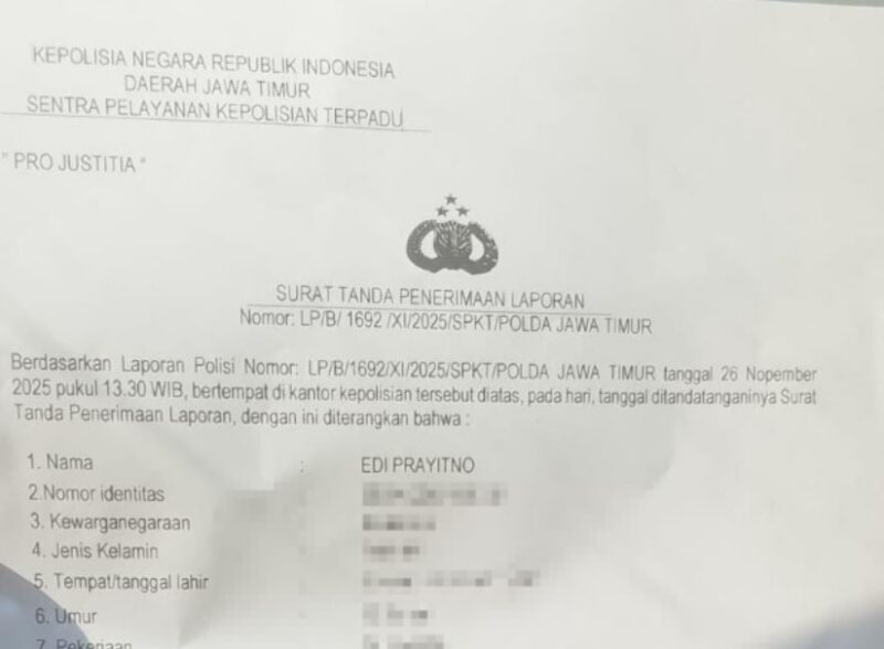 SURABAYA, TRISAKTINEWS.COM — Seorang jurnalis profesional, Edi Prayitno, resmi melaporkan dugaan pengancaman melalui media elektronik serta penyebaran sebuah video bermuatan intimidasi ke Polda Jawa Timur pada Selasa, 26 November 2025. Laporan tersebut tercatat dengan nomor LP/B/1692/XI/2025/SPKT/POLDA JAWA TIMUR.